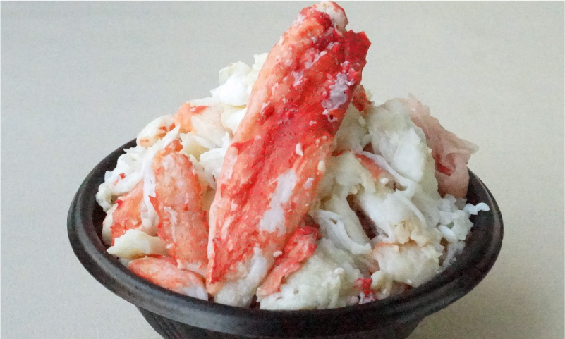たらばガニのむき身が山盛りの上にドーンと棒肉を乗せた逸品。