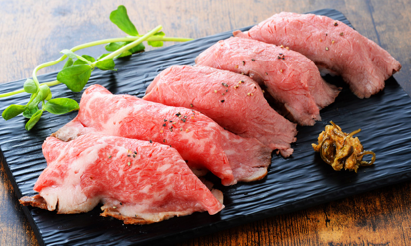 北海道産牛のサーロインと赤身の食べ比べ。北海道お土産グランプリ準GP受賞「北海道産山わさび昆布醤油 」が肉寿司のうまさをさらに引き立てます。