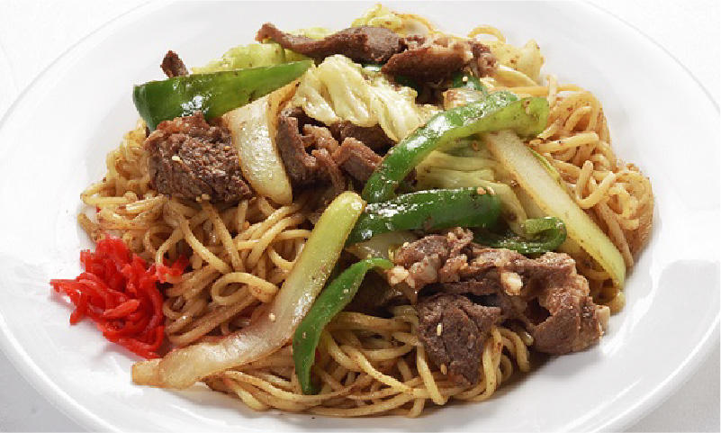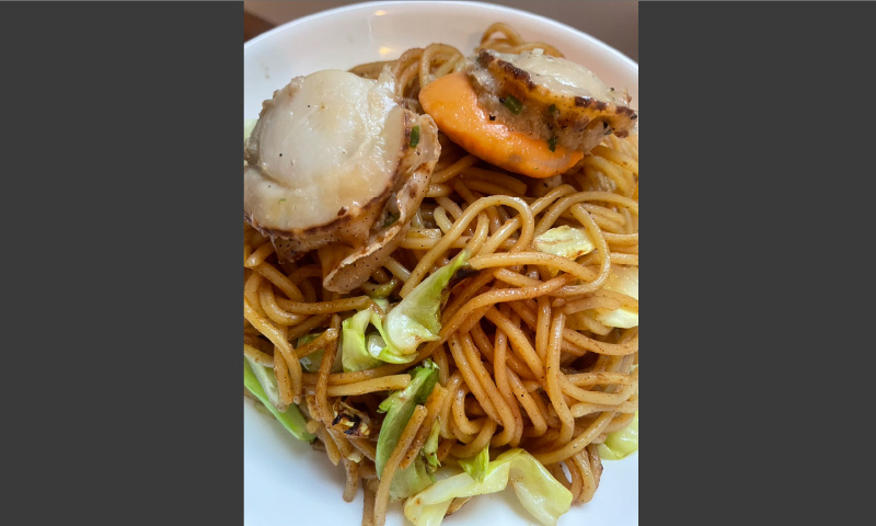 ご当地グルメ室蘭製麺の麺と、特製カレーたれ、ホタテが絡み合う海鮮焼きそば。