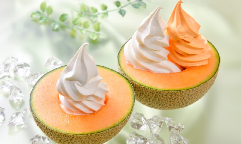 北海道産赤肉メロンを半玉使い、その上にミルクとメロンのソフトクリームをのせた、豪快で満足度200%のスイーツです。
